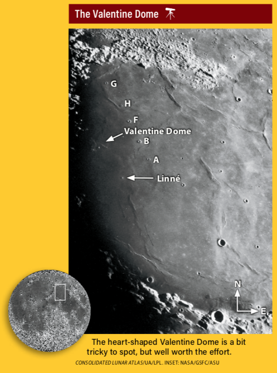 Instead of focusing on Mars tonight, instead key in on the Moon. Tonight’s target is the Valentine Dome — a gently sloping heartshaped dome rising less than 400 feet (122 meters) above the lunar surface. It’s only visible at low Sun angles, such as today. By tomorrow, it will be all but invisible as the angle of the sunlight changes.