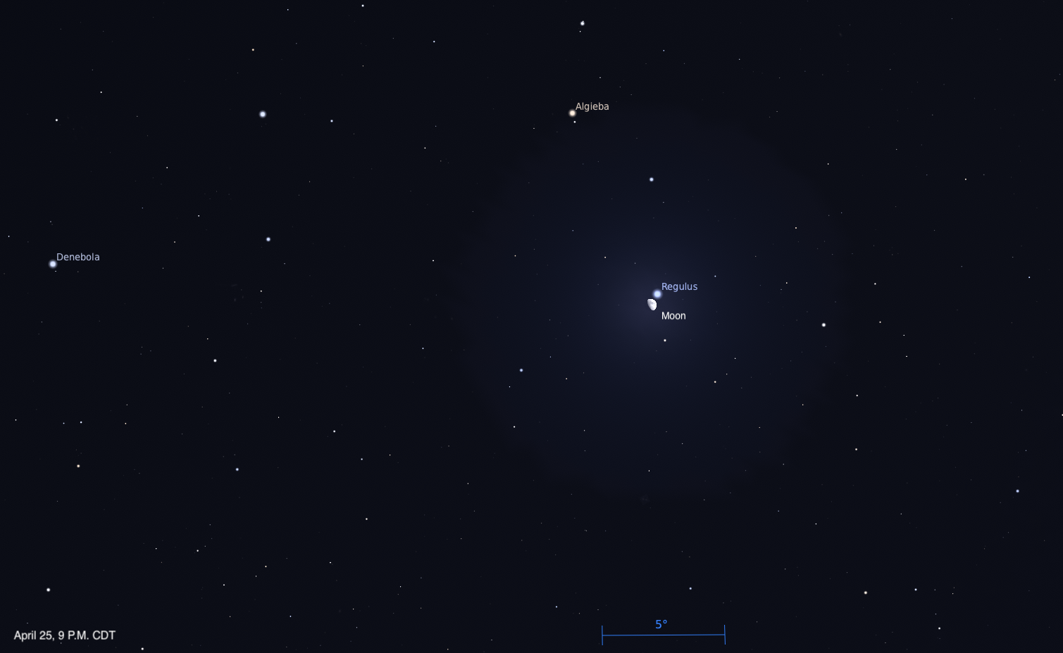 The Moon passes 0.2° north of Regulus at 9 P.M. EDT. Before this, our satellite occults (passes in front of) the bright star in Leo the Lion for some locations in South, Central, and North America — including portions of the eastern U.S.