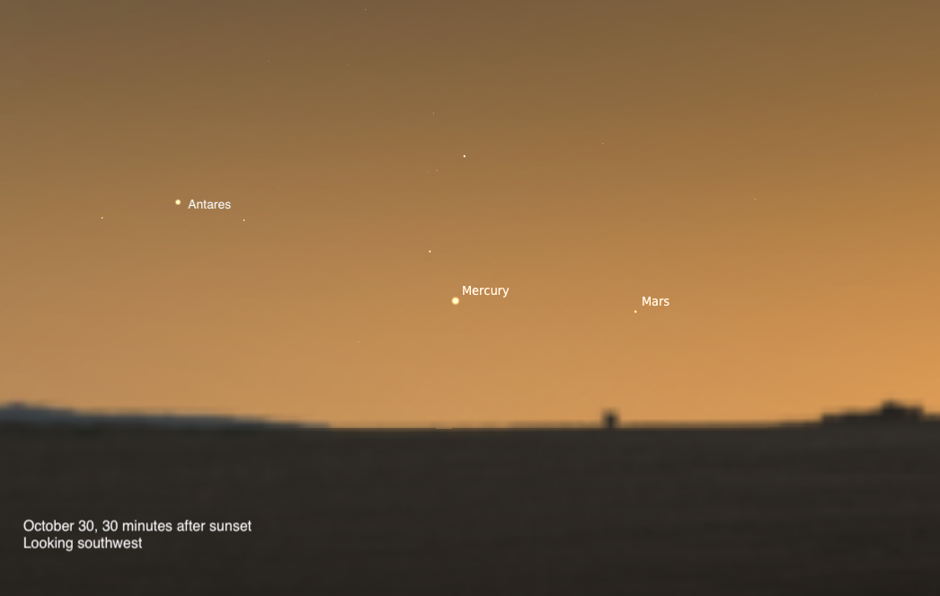- On October 29, Mercury (magnitude –0.1), Mars (magnitude 1.4), and Antares (magnitude 1.1) will be visible low in the western sky after sunset, with Mercury positioned between Mars and Antares.