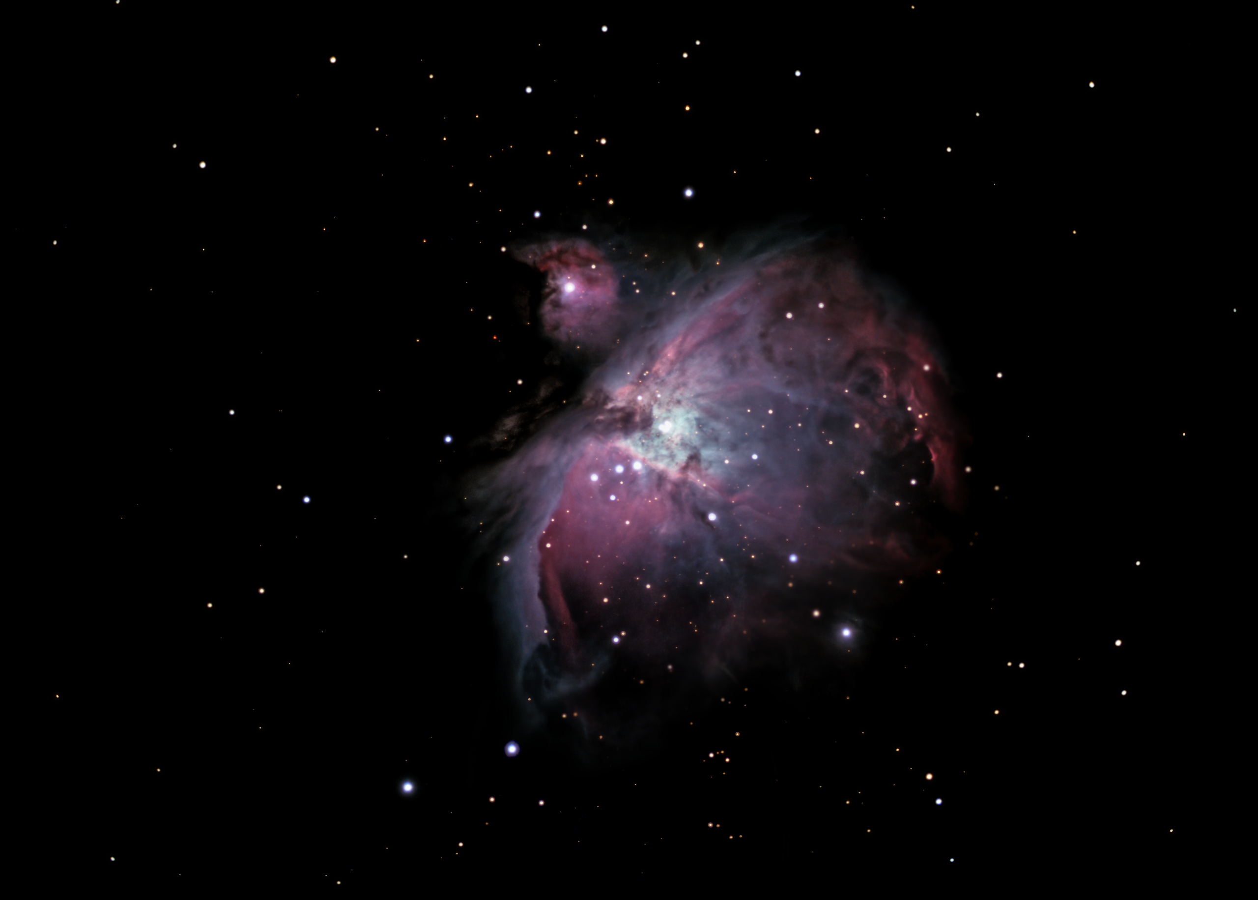 - At the core of M42 lies the Trapezium Cluster, a young open cluster of stars, including Theta1 Orionis (magnitude 5.1), whose stellar winds are actively carving a cavity within the surrounding gas and dust.