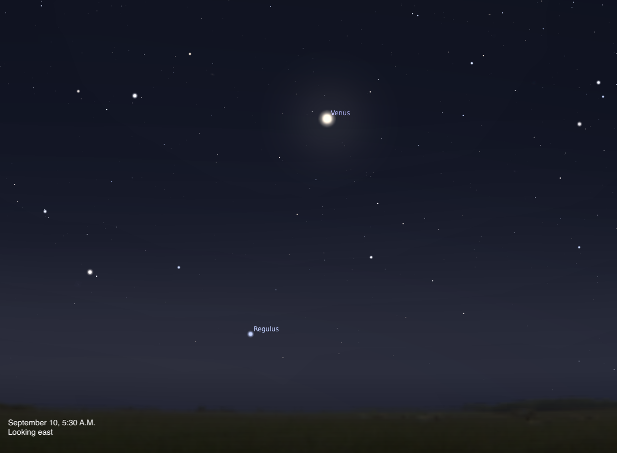 Regulus and Venus are more than 11° apart this morning, but that will quickly change. In just over a week, Venus and the Moon will stand in line with Regulus, both within 1° of the star. We’ll definitely check back then!