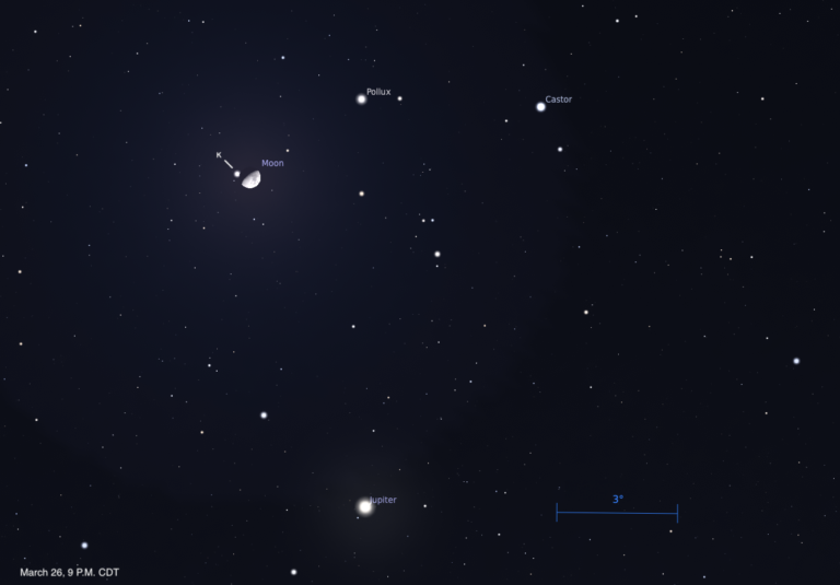 The Moon passes 4° south of Mars in Virgo at 11 A.M. EDT. The pair is briefly visible — along with Virgo’s brightest star, Spica — for a short time after sunset this evening.