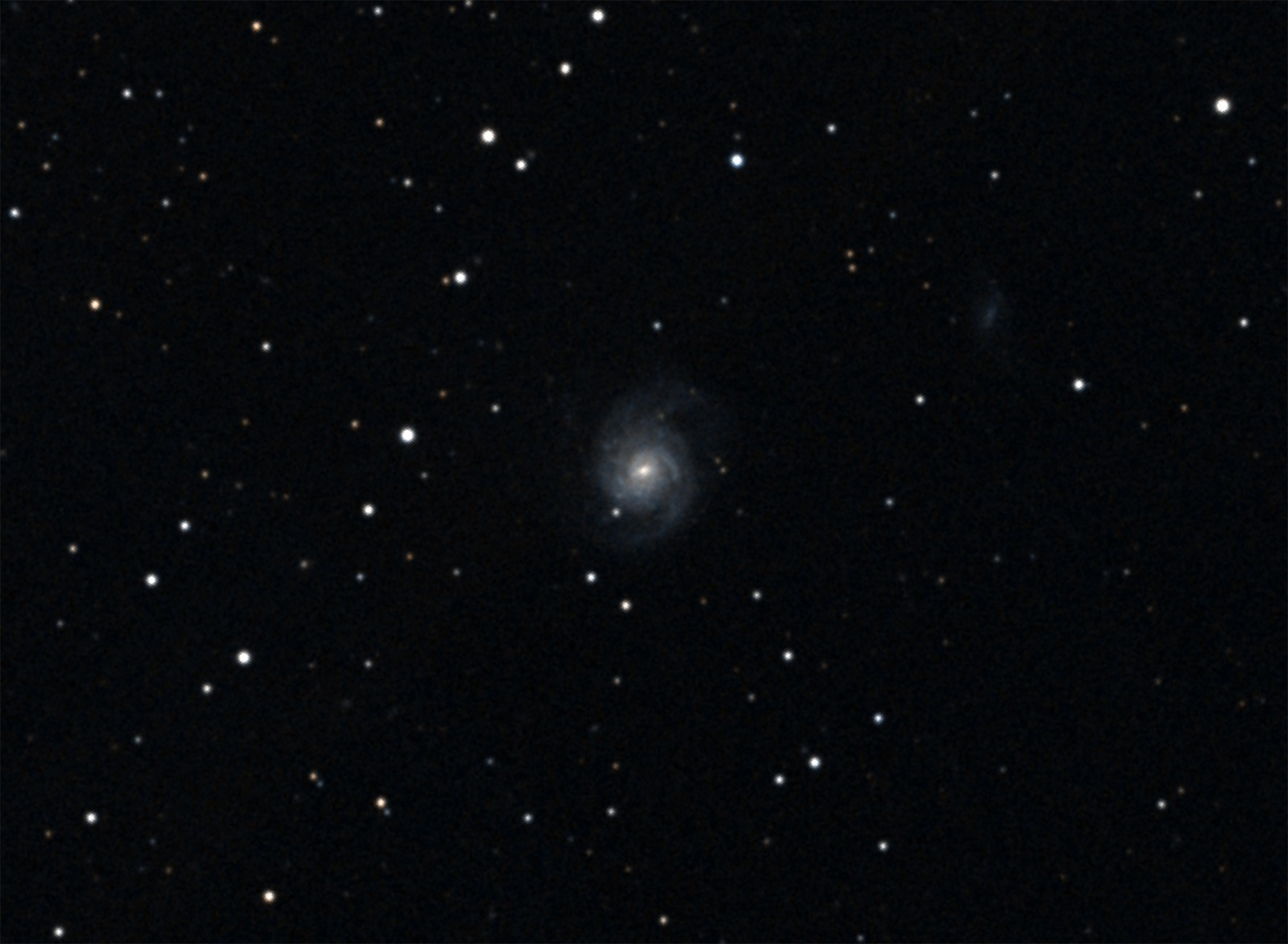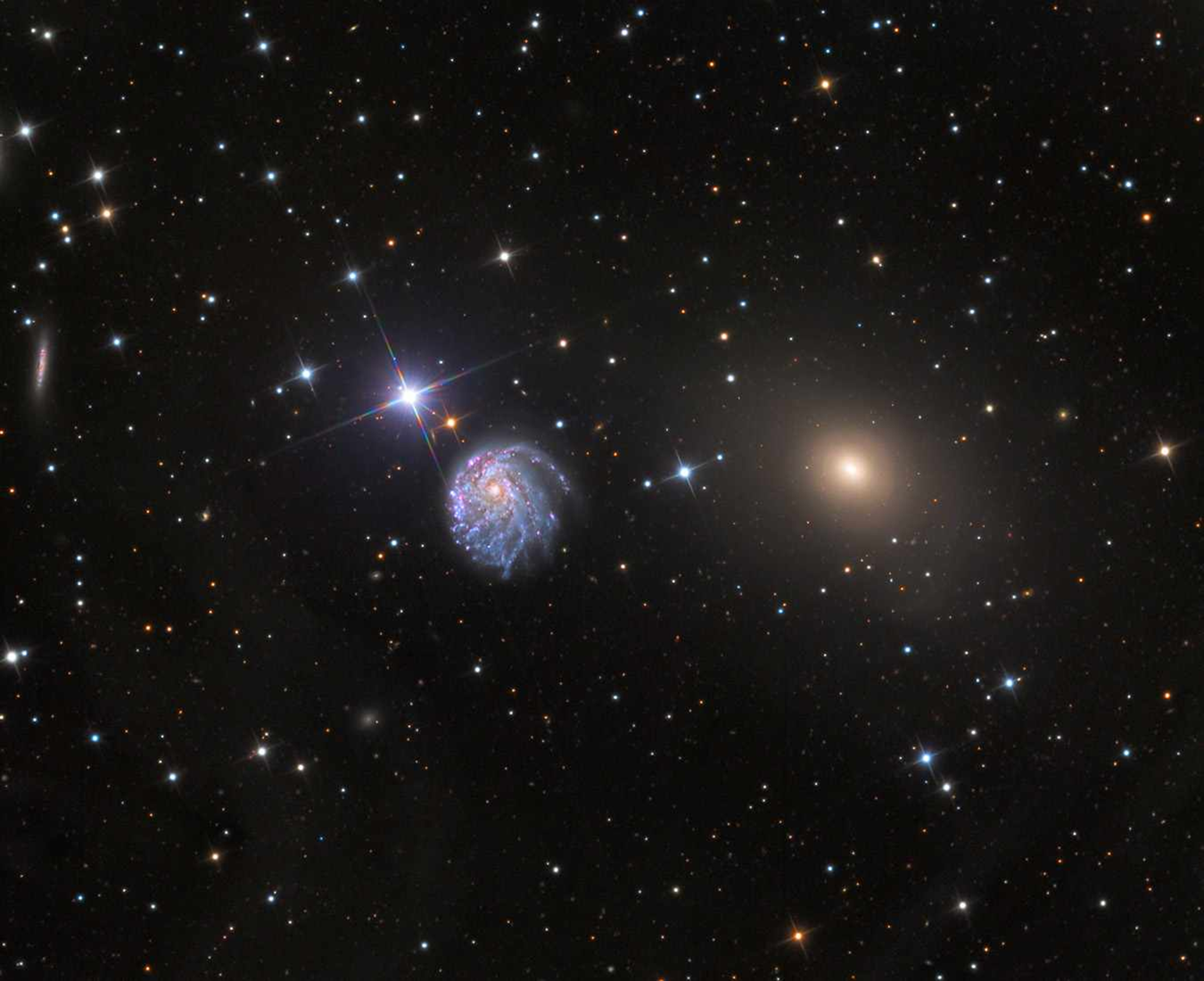 Moving into the King’s domain, NGC 2276 and NGC 2300 may be my favorite objects in the north polar region. NGC 2276 by itself is also designated No. 25 in Halton Arp’s 1966 Atlas of Peculiar Galaxies, while both galaxies together are cataloged as Arp 114. The apparent proximity of the spiral NGC 2276 to the lenticular galaxy NGC 2300 led Arp to classify the pair as interacting. Redshift data indicate these galaxies today have a separation of some 23 million light-years — far greater than the Milky Way and Andromeda. NGC 2300 is closer, at 90 million light-years away, while NGC 2276 is 113 light-years distant.