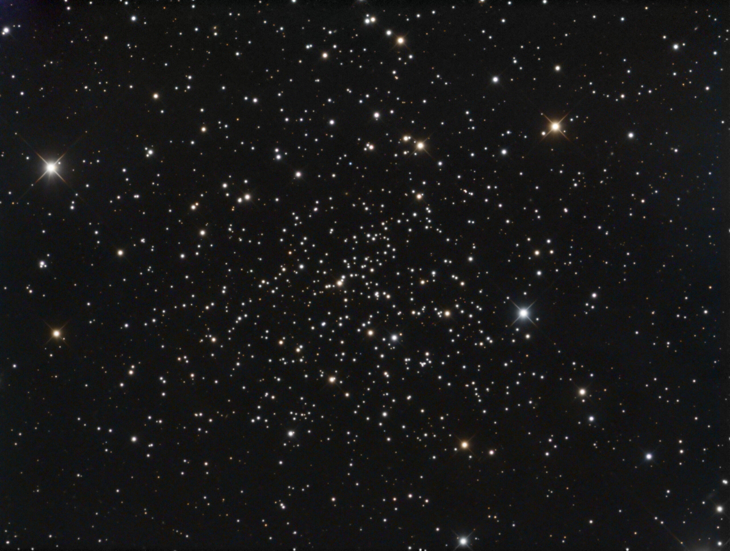 NGC 188 is the northernmost open cluster in our sky. Discovered by John Herschel in 1831, it is 5° from the North Celestial Pole. Far from the galactic plane, its isolation has kept the cluster’s members from wandering away. Its estimated age is 6.8 billion years, significantly older than our Sun’s 4.6 billion years. At a distance of 5,400 light-years, the group’s apparent diameter of 15′ translates to about 20 light-years across. The loose conglomeration of about 100 stars can be seen through an 8-inch scope. Use low power to get a feel for its shape and density. See if higher magnification can pick up star colors. It is known to contain blue stragglers — older stars that appear much younger (bluer, and thus hotter), which astronomers believe are formed when two stars merge either via collision or accretion to create a single younger-looking star with a new source of fuel.