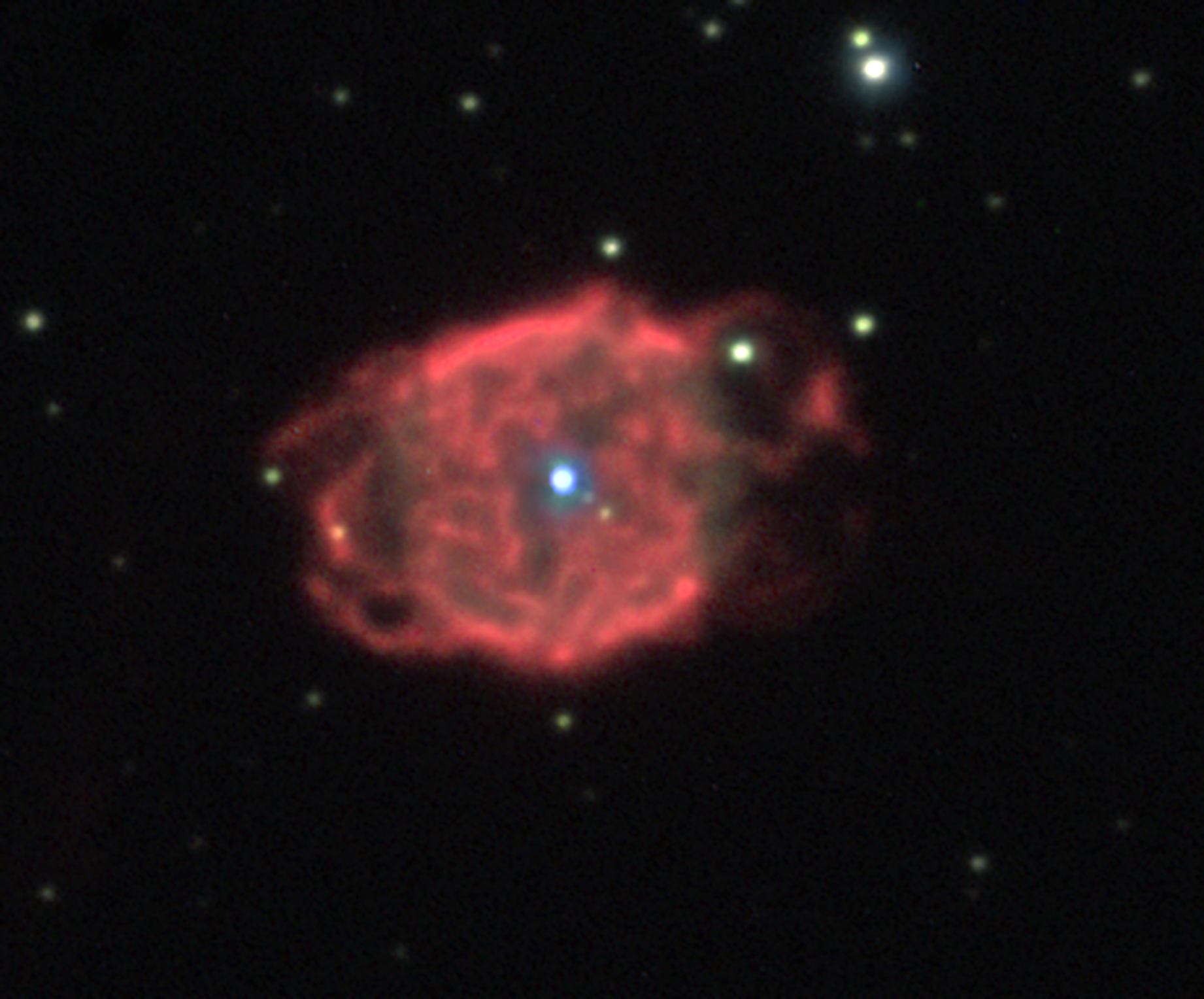 The northernmost planetary nebula is the southernmost object featured on this list. NGC 40 in Cepheus lies 18° from the North Celestial Pole. Discovered by William Herschel in 1788, it’s magnitude 11.5 and 36″ in diameter, with a conspicuous magnitude 11.6 central star. It is sometimes called the Bow-Tie Nebula, but perhaps the Parentheses Nebula might be more apropos — in large telescopes, the partial ring structure visually resembles a parentheses around the star.