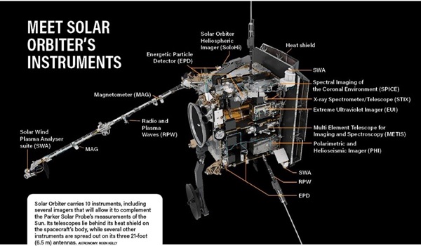 Most of the in-situ instruments occupy an extendable boom to minimize interference from spacecraft electronics. The Radio and Plasma Waves instrument from France’s Observatoire de Paris has sensors on the boom and on three monopole antennas, angled 90° apart. UCL’s Solar Wind Plasma Analyser also has detectors on the boom and antennas, plus two more on the main spacecraft body, including a NASA heavy ion sensor. These will study the densities, velocities, temperatures, and compositions of solar wind ions and electrons. “The relative composition of the heavy ions provides a kind of fingerprint, which can be compared with similar information from spectroscopic measurements of the solar surface and thereby confirm the link between the source and the spacecraft,” Owen says. “These measurements should help us reveal how the dynamics of the Sun drive the solar wind and its variability, how that links into interplanetary space and affects Earth’s near-space environment.”