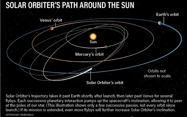 After its launch, Solar Orbiter will cruise past Venus in December 2020 and again in August 2021, then execute a nail-biting skim within 270 miles (435 km) of Earth in November 2021. These gravity assist maneuvers (GAMs) will reduce orbital energy and increase inclination, pulling the spacecraft closer to the Sun. In its final orbit, it will circle our star every five months, approaching within 60 solar radii (0.28 AU) at perihelion and drifting to 220 solar radii (1 AU) at aphelion.