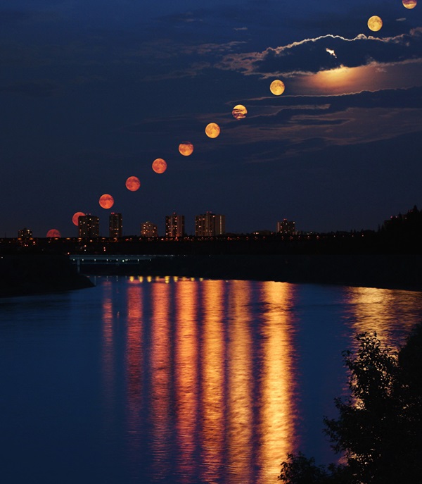A number of other variables play into the time difference. The Moon’s orbital speed is not constant, so its motion relative to the stars can be up to 12 percent faster or slower than the average during the month. Latitude also changes the numbers significantly because it alters the angle at which the lunar orbit meets the eastern horizon. In November 2015, the moonrise delay ranges from 42 to 58 minutes at 30° north and from 30 to 63 minutes at 50° north. In general, the closer you live to the equator, the less variation you will see.