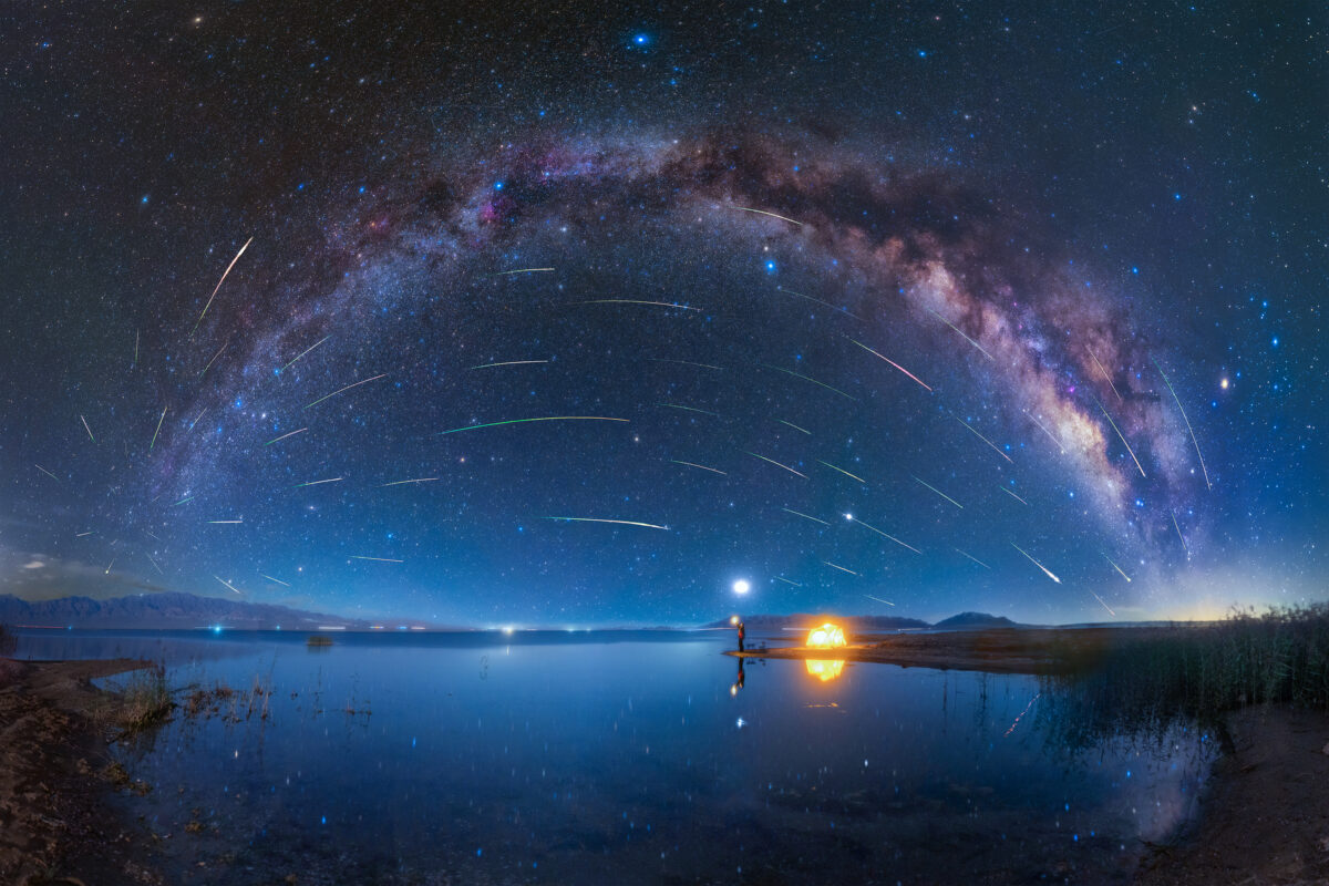 The Perseid meteors streak across the sky from its radiant in the constellation Perseus appearing in this perspective to be lobbed across the sky. This panorama of 17 stitched 60-second frames was taken with a Nikon DSLR at 14mm lens at f/1.8. Sky frames were captured at ISO 2000 and the foreground at ISO 800.