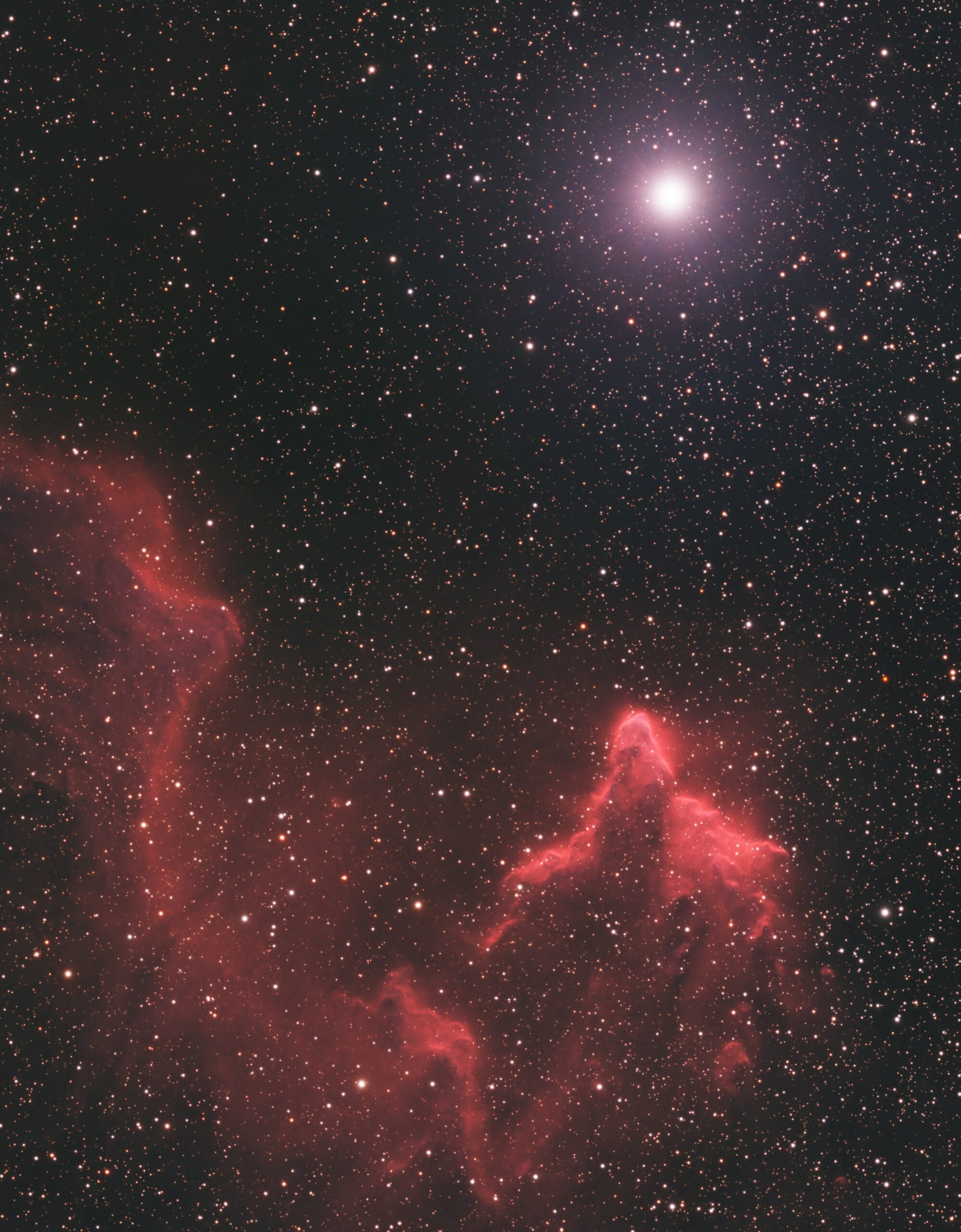 The star Gamma (γ) Cassiopeia sets aglow the interstellar clouds of IC 63 and IC 59, which appear like a ghost and its tail, respectively. This imager used a 5-inch refractor to take exposures in HαRGB filters of 5.4, 2, 2, and 2 hours, respectively.