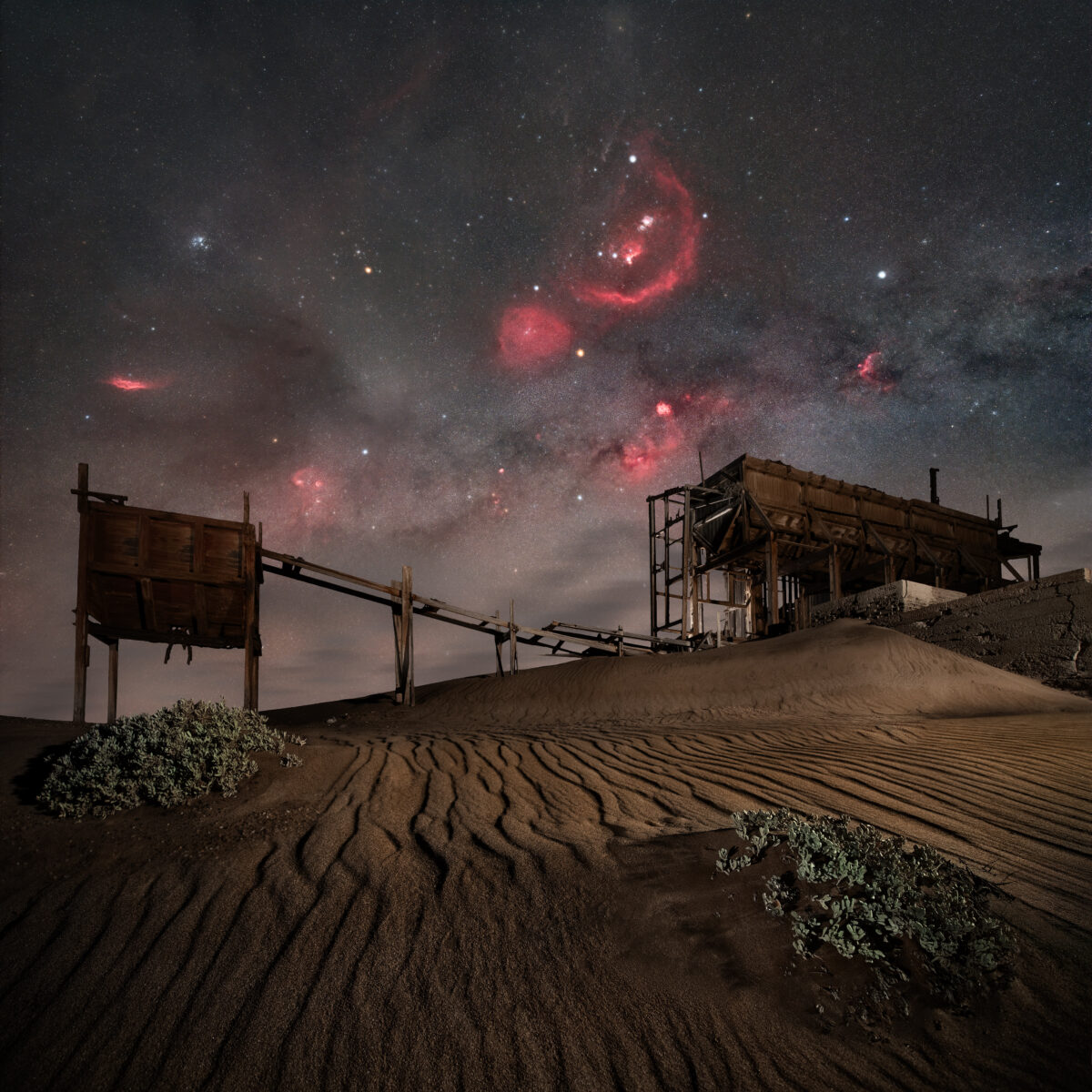 Barnard’s Loop, the Pleiades (M45), and the California Nebula (NGC 1499) are just some of the deep-sky objects aglow with ionized hydrogen in the sky over an abandoned washing plant at a diamond mine in the Sperrgebiet (“forbidden territory”) of southwestern Namibia. Th photographer used an astromodified Sony mirrorless camera at ISO 800 and zoom lens at 20mm and f/2.8 to capture one hour of sky exposures and an 8-minute ground exposure.