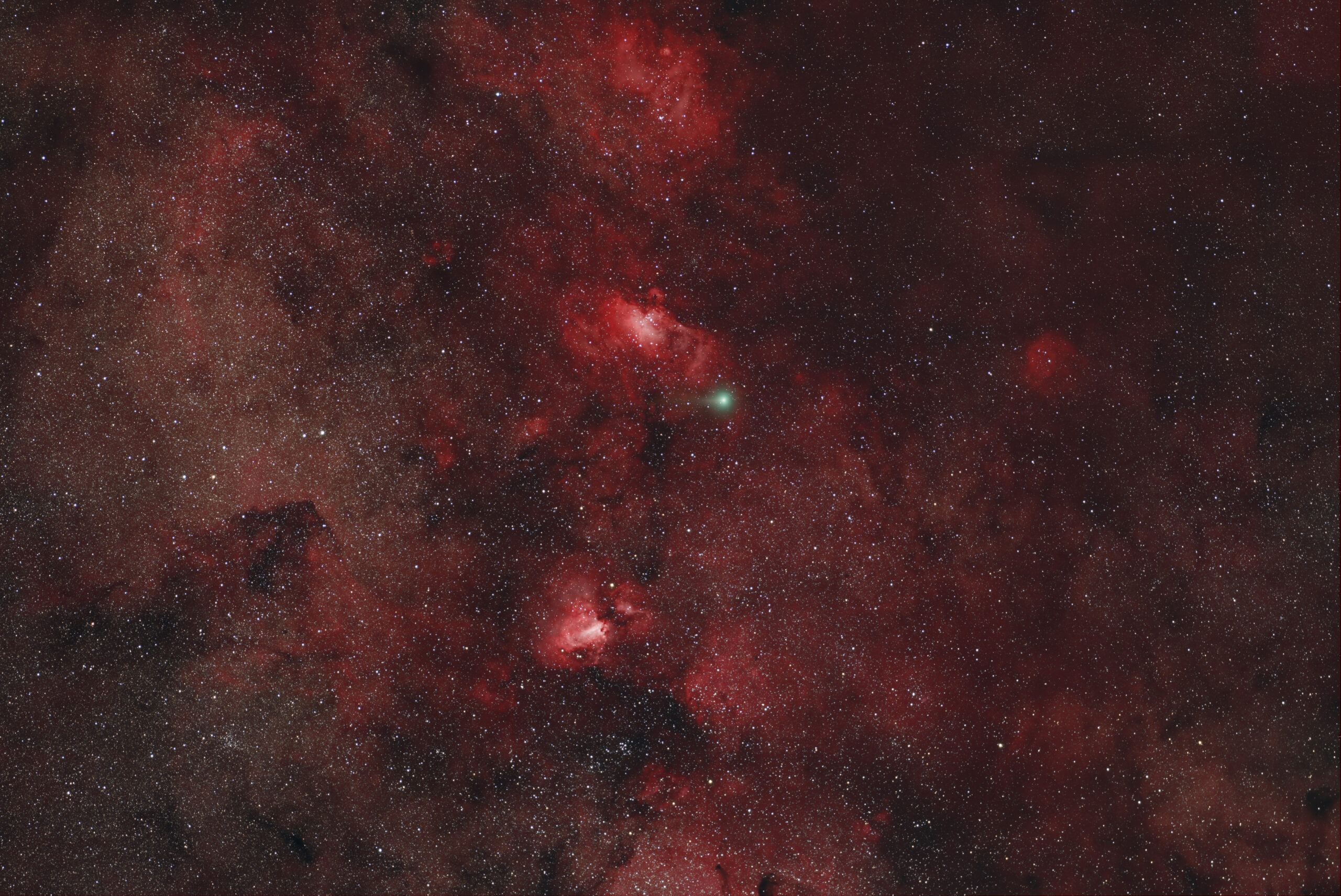 Back to Pic of the Day List Flocking through the galaxy Chris Schur, taken from Payson, Arizona Comet SWAN (C/2025 R2) glides between the Eagle Nebula (M16) and the Swan Nebula (M17) in this image taken Oct. 17 over 45 minutes with an 8-inch RASA.