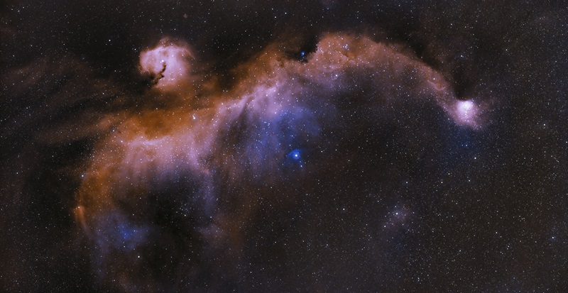 The Seagull Nebula refers to the region of nebulosity cataloged as objects NGC 2327 (the gull’s head) and IC 2177 (its wings). This image comprises three panels, each representing roughly forty-five exposures of 300 seconds each for a total exposure time of over 11 hours. A dual-bandpass Hydrogen-alpha and Oxygen-III filter was used to block light pollution.