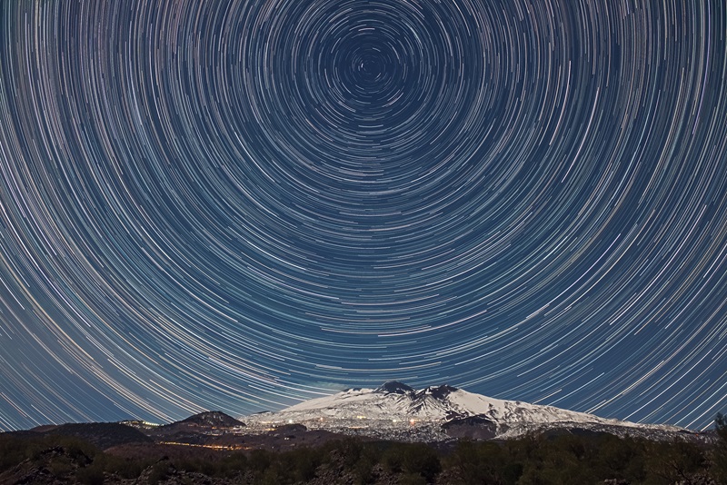 Back to Pic of the Day List Trails over Etna Gianni Tumino from Ragusa, Italy Stars leave trails of light over Sicily’s Mount Etna, one of the most active volcanoes in the world. This photo was taken with a 35mm lens at f/4 and 585 seven-second exposures at ISO 1250.