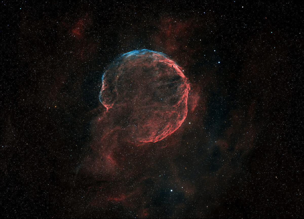 CTB 1 (Abell 85) is a faint supernova remnant in Cassiopeia roughly 9,800 light-years distant. Originally classified by George Abell as a planetary nebula, it’s over half a degree wide — larger in apparent size than a Full Moon. This Hα/OIII/RGB image was taken with a 4.2-inch refractor at f/5 and 8.25 hours of exposure.