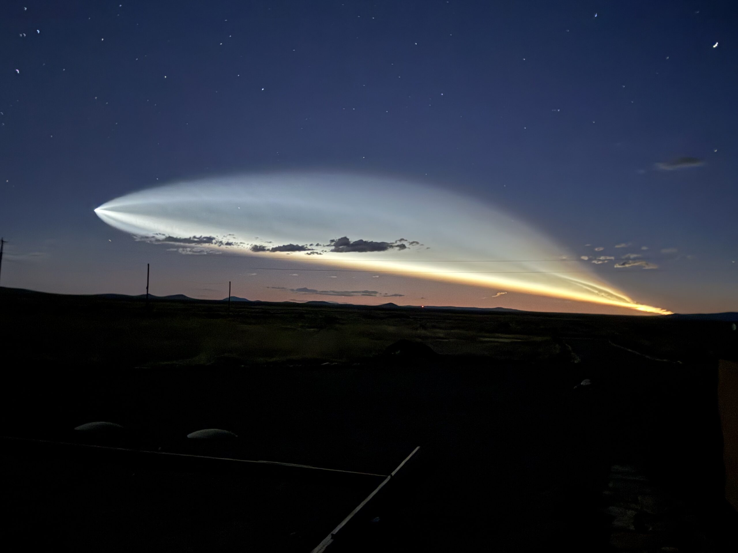 The twilight launch of SpaceX’s Starlink Group 11-20 batch of satellites from Vandenberg Space Force Base in California resulted in a plume visible up to 600 miles (1,000 km) away, captured here from New Mexico with an iPhone 15 Pro. The distinct profile of the exhaust — often called a “space jellyfish” — results from sunlight catching the exhaust plume as it expands rapidly into the thinner air at higher altitudes.