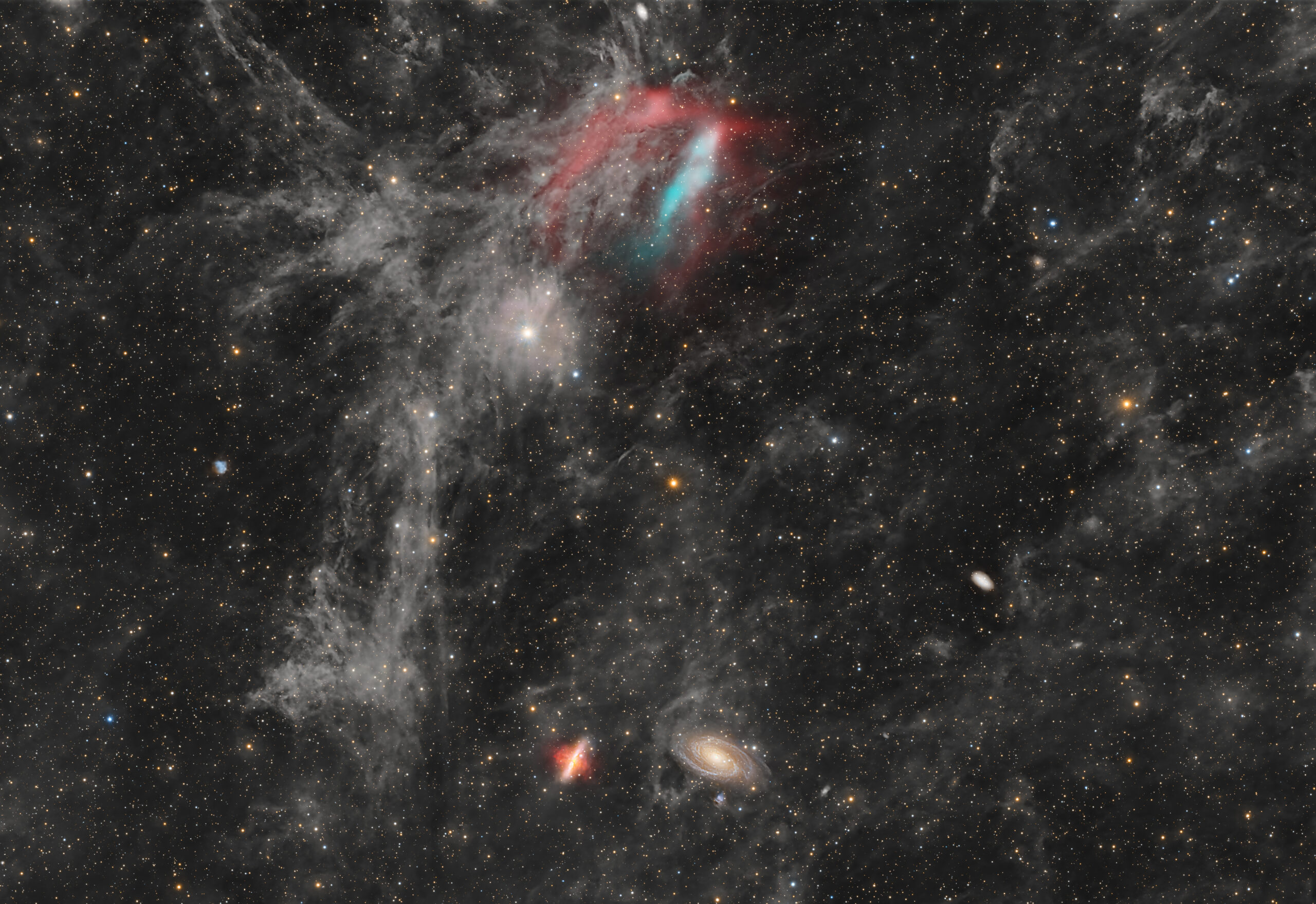 The region around the galaxies M81 and M82 is known for its copious amount of galactic cirrus — foreground dust that lies in our own galaxy. This dust is illuminated not by any individual star or cluster but the galaxy’s overall, ambient glow. Zoom out far enough and among these wispy clouds lies the Vulcan Nebula (WPS 46), appearing perched above them in this deep exposure of 193⅓ hours. The imagers used a 135mm f/2 lens and both monochrome and one-shot color cameras, using LRGB as well as Hα, OIII, and dual-band SII/OIII filters.