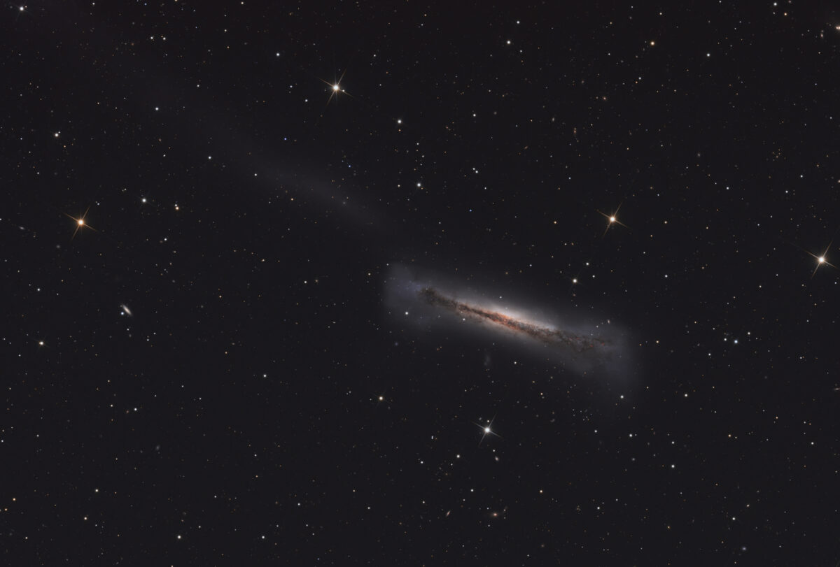 NGC 3628 — sometimes called the Hamburger Galaxy — is perhaps best known as part of the Leo Triplet of galaxies. But it takes a solo bow in this HαLRGB image, taken over 14.1 hours with a 10-inch f/4.0 scope. Visible to the galaxy’s left is its extended tidal tail, some 300,000 light-years long, created by an interaction with another galaxy.