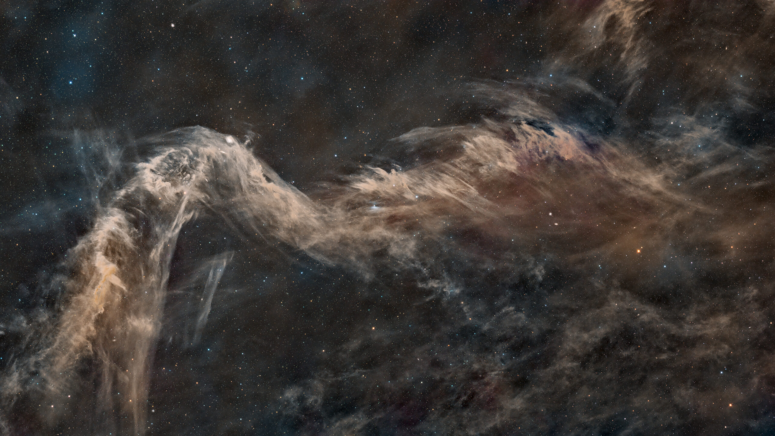 This complex of dust snaking through the southern constellation Apus the Bird of Paradise is catalogued as Mandel-Wilson 9 and more commonly called the South Celestial Serpent. It’s an example of galactic cirrus or an integrated flux nebula, lit dimly not by a single star or cluster but the overall glow of the Milky Way. The imager took 46⅓ hours of RGB exposure with a 6-inch f/3.3 scope.