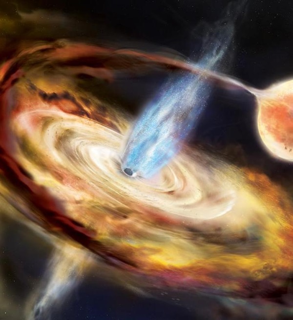While many black holes are simply sitting calmly in space without nearby material to consume, some are in binary systems where one star has become a black hole, while the companion is at an earlier stage in its life. This is the case for J1820 — the black hole is pulling material off a star, which forms a swirling disk of material that heats up as it falls inward toward the event horizon and disappears. The accretion disk is relatively flat and thin, as its name implies, shining at a temperature of about 18 million degrees Fahrenheit (10 million degrees Celsius). Closer to the black hole lies a spherical “corona” of even hotter electrons, protons, and positrons at almost 2 billion F (1 billion C).