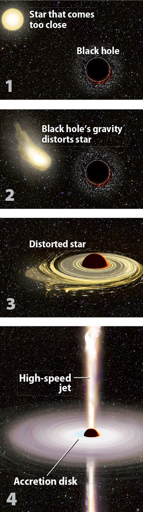 Prolonged high-activity and high-luminosity periods (which last tens of million of years) can result from galaxy-galaxy interactions and mergers, which funnel large amounts of dust and gas toward a central black hole. Sudden black hole accretion events, due to stars or dust and gas clouds that pass too close to the black hole and get pulled in by the black hole’s gravity, can increase the emission of a black hole and produce brief bursts of light — even for seemingly quiescent ones. Such events are occurring at the center of the Milky Way.