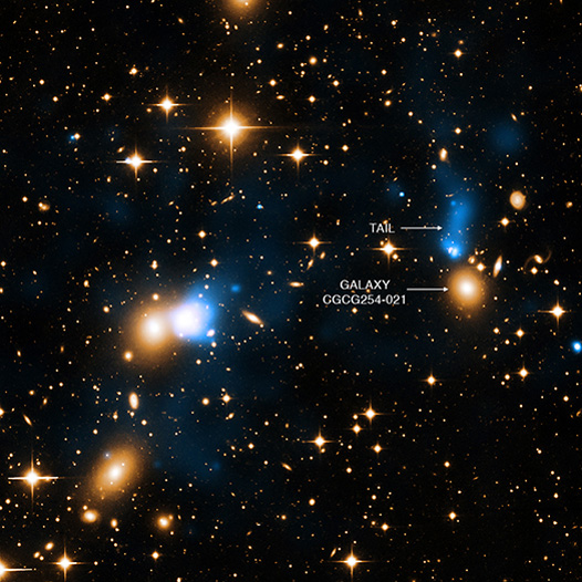 “The large separation between the galaxy and the tail might be telling us that the gas has been completely stripped off the galaxy,” said Thomas Reiprich, also from Bonn. “In effect, the tail has been cut off from the galaxy.”