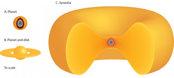 Scientists proposed a new type of planetary object they are calling synestia, where a celestial body violently collides with another body, resulting in a donut-shaped disk of vaporized rock. After some time, the body will cool down and turn into the solid, round planets we currently know.
