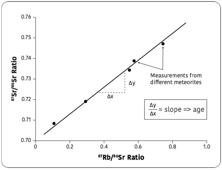Rubidum-87 (87Rb) undergoes a standard beta decay to Strontium-87 (87Sr) by spitting out an electron and an antineutrino; the half-life is 49 billion years. The problem is, 87Sr is already present in some unknown quantity in the sample before the radiogenic atoms of this isotope start appearing from the Rb decay. To solve for this unknown, we also measure the amount of 86Sr, a stable, non-radiogenic isotope, in the sample, and construct the plot shown; a little algebra shows that the slope of the line gives the age.