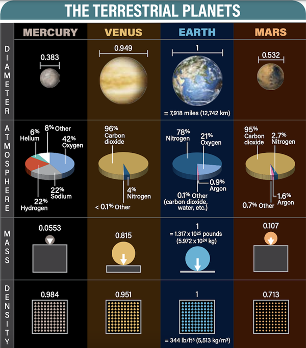 We do know that Venus rotates retrograde, or backward, compared to its orbital motion around the Sun — the only planet to do so. Although its core is still hot, like Earth’s, Venus has no plate tectonics. Its oppressively thick atmosphere is about 96 percent carbon dioxide, 4 percent nitrogen, and less than 0.1 percent other gases. Earth has a comparatively light atmosphere consisting of 78 percent nitrogen, 21 percent oxygen, and 1 percent other gases.