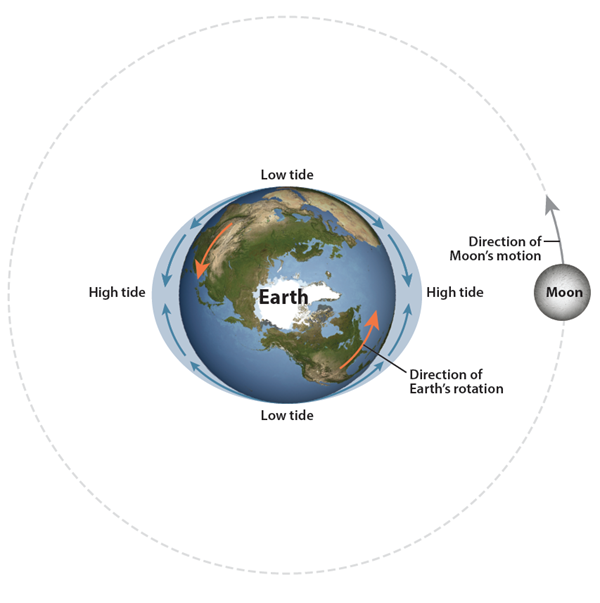 - The primary mechanism for oceanic tides is the Moon's differential gravitational force, which creates two high-tide bulges—one directly beneath the Moon and another on the opposing side—leading to two high and two low tides daily in most regions as Earth rotates.