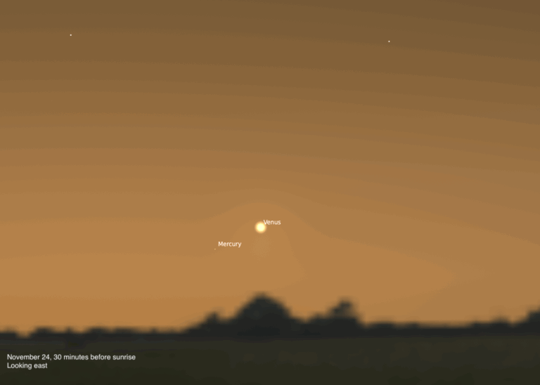 Another pretty vista beckons October 28 when Mars and Jupiter appear 4.5° apart with Venus hanging between the two. By October’s final morning, Jupiter stands highest while Venus has closed to within 1.4° of Mars. The latter two will experience a close conjunction of their own in early November.