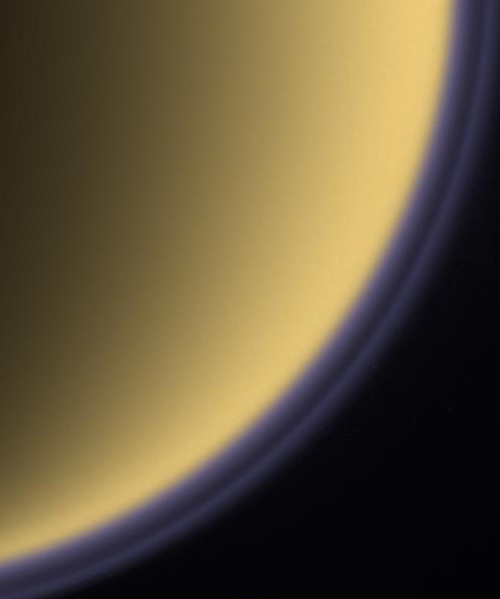 Late last month, Cassini revealed a view of Titan from another end of the spectrum. Imaging in the ultraviolet, the spacecraft found two distinct layers of haze, providing scientists with another puzzle. Titan’s dense atmosphere — which is mostly nitrogen with a few percent methane — forms haze particles in the presence of ultraviolet light. Scientists believe the process begins in the high atmosphere, at altitudes above 250 miles (400 kilometers), where ultraviolet light breaks down methane and nitrogen molecules. The byproducts probably react to form complex organic molecules that combine into the small haze particles.