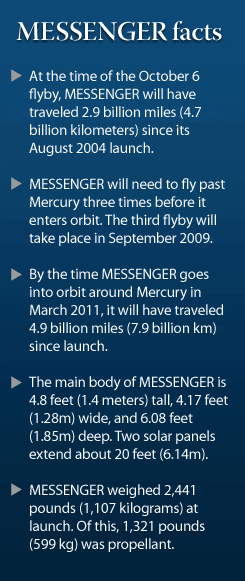WAUKESHA, Wis. — At 12:31 A.M. EDT October 6, NASA’s MESSENGER spacecraft will skim within 125 miles (200 kilometers) of Mercury’s surface. MESSENGER – short for MErcury Surface, Space ENvironment, GEochemistry, and Ranging – has flown past Mercury once already this year. On January 14, the craft came equally close to the innermost planet, imaging Mercury’s cratered surface and studying its puzzling magnetic field and thin atmosphere.