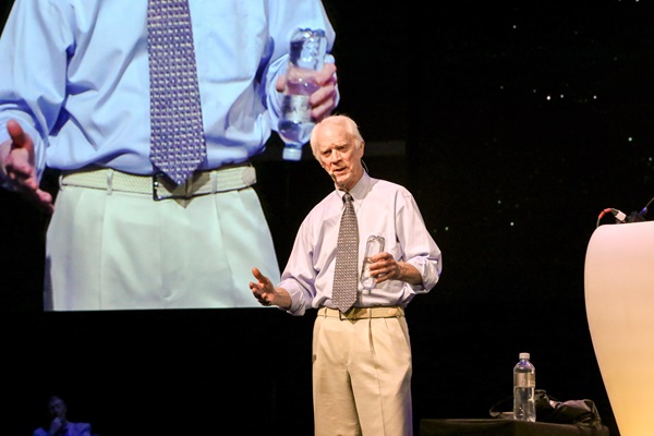 Then, after a break, May and I delivered a 3D presentation, complete with viewing glasses handed to the audience, sharing stereoscopic views of Apollo images from our recent book, Mission Moon 3-D. After being joined by Duke for some firsthand accounts, we conducted a press conference about the book project. Following this came Fadell, who spoke on technology synergies between Earth and space, and Sir Martin Rees, England’s Astronomer Royal, who delivered a lecture on the prospects for humanity.