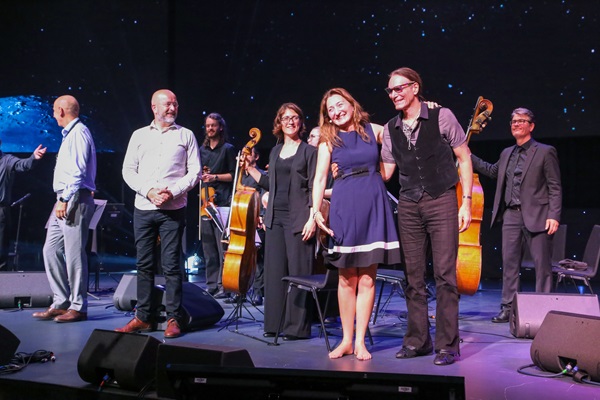 The renowned composer Hans Zimmer led the 21st Century Symphony Orchestra in a stirring series of anthems — titled “Once Upon a Time on the Moon” — throughout the evening. Musicians involved with the show included master of the keyboards Rick Wakeman and the guitar virtuoso Steve Vai. Astronaut Chris Hadfield performed a tribute to David Bowie with his rendition of “Space Oddity.”