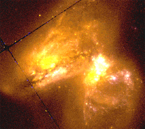 Dust is so thick in Arp 299’s nuclei the only radio waves offer a glimpse of star formation there. In 2003, James Ulvestad (National Radio Astronomy Observatory), Susan Neff (NASA’s Goddard Space Flight Center), and Stacy Teng (University of Maryland) identified four compact radio sources they characterized as young supernovae — all within a span of 330 light-years in the eastern nucleus. They dubbed the region a supernova factory.
