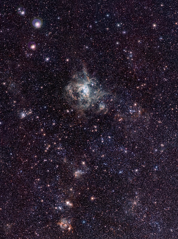 But even binoculars pointed its way will reveal a smudgy spot that grows more astonishing and beautiful with each optical power step-up. It took more than 140 years after the creation of the first telescope — until the observations of Nicolas Louis de Lacaille in 1751 — for astronomers to apprehend this blotch’s nebular nature. Soon called the Tarantula Nebula (NGC 2070) because of its spidery, multicolored tentacles, it is possibly the most beautiful entity in the known universe.