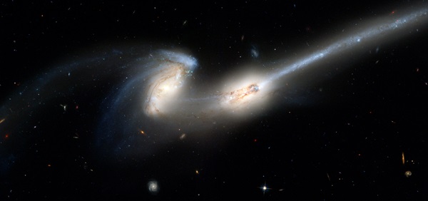 So what happens when galaxies approach? If the interaction takes place between two galaxies of different sizes, the larger object normally draws the small one into a long arc, extending it like taffy being pulled apart. The large object is relatively unaffected.