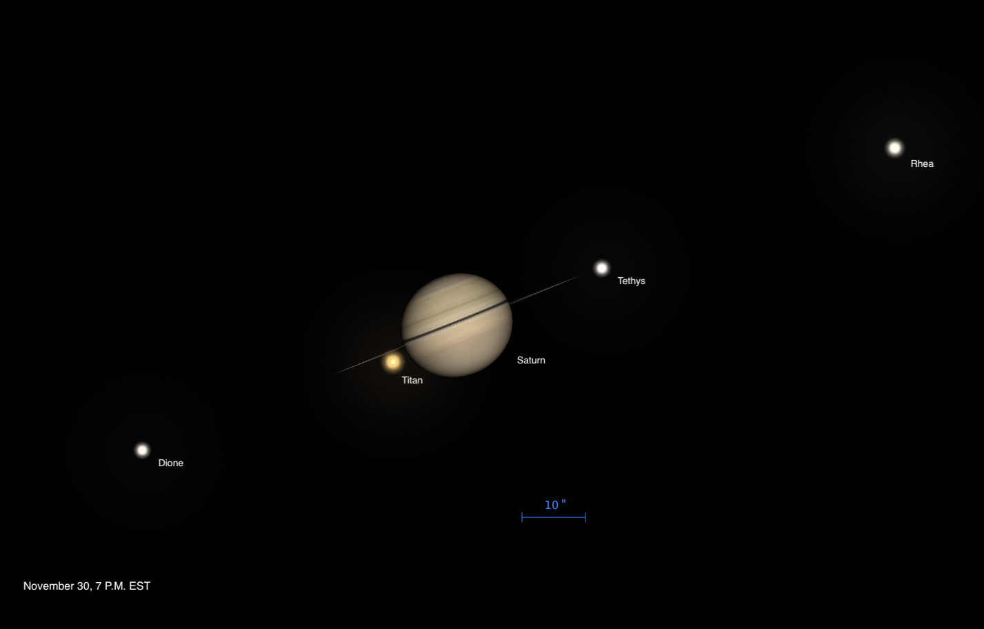 Also visible may be Saturn’s trio of 10th-magnitude moons, Tethys, Rhea, and Dione. Dione lies to Saturn’s east, off the end of the rings, while Rhea is far from the planet on the west and Tethys closer to Saturn, also on the west. Tethys is closing in for its own occultation behind the ringed world, and will disappear behind Saturn’s northwestern limb shortly after 9:45 P.M. EST. Note, however, that Tethys is very close to the edge-on rings, which may dim the moon’s brightness somewhat.